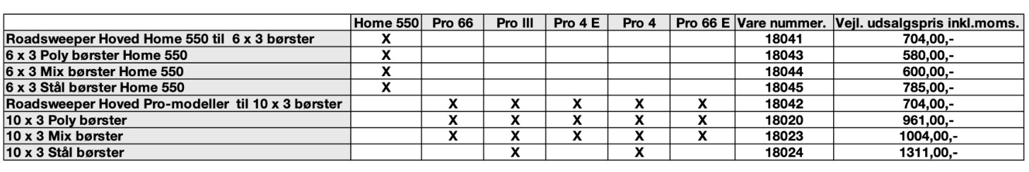 Alle vores fliserensere kan bruges med specialbørsterne, ved tilkøb af et Roadsweeper hoved. Herunder finder du en guide til hvad der passer til de forskellige maskiner og varenumrene på produkterne.